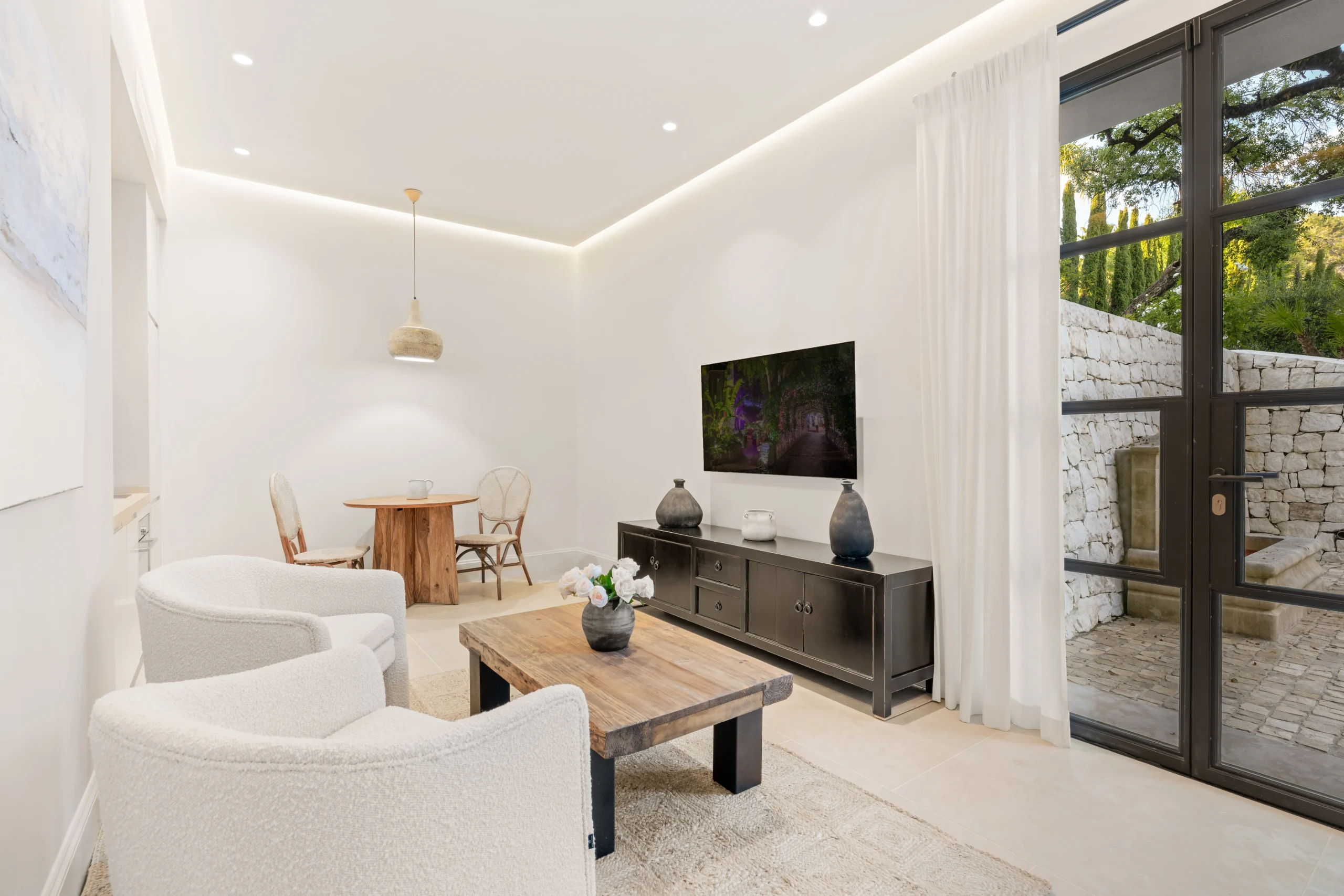 Construida bajo los más altos estándares, la villa incluye una cocina gourmet equipada con electrodomésticos Lacanche, gimnasio privado, dos chimeneas, sala de cine, sala de juegos, sauna seca y húmeda, además de un espacio versátil que puede adaptarse como despacho o biblioteca. Una verdadera joya inmobiliaria que une lujo, privacidad y confort moderno en una de las direcciones más exclusivas de Marbella.